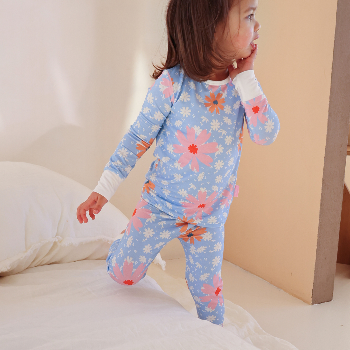 Pijamale 2 piese, material din bambus, ZIPSTER - Daisy, Bleu cu floricele Roz, pentru fetite