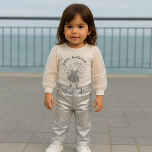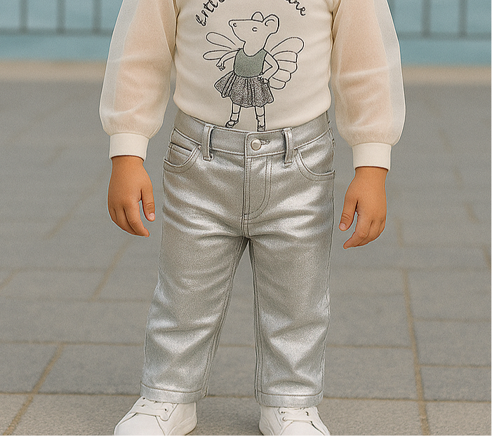 Acești blugi lucioși argintii reprezintă o alegere sofisticată, perfectă pentru evenimente, sărbători sau ocazii speciale, asigurând atât un look elegant, cât și un confort adecvat pentru micuțele fashioniste.