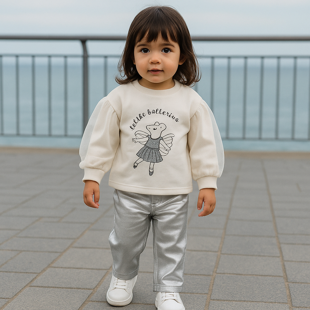 Fabricată în Turcia, această bluză chic completează perfect stilul micilor balerine, îmbinând confortul cu un design deosebit.