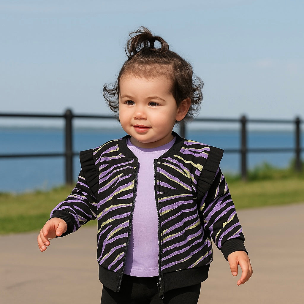 Adaugă un plus de stil și confort garderobei micuței tale cu bluza de trening cu fermoar din colecția Zebra's de la Panco. Cu un imprimeu jucăuș de zebră lila și detalii delicate de volănașe la umeri, această bluză combină designul modern cu funcționalitatea, fiind ideală pentru fetițele cu vârste între 0 și 3 ani.