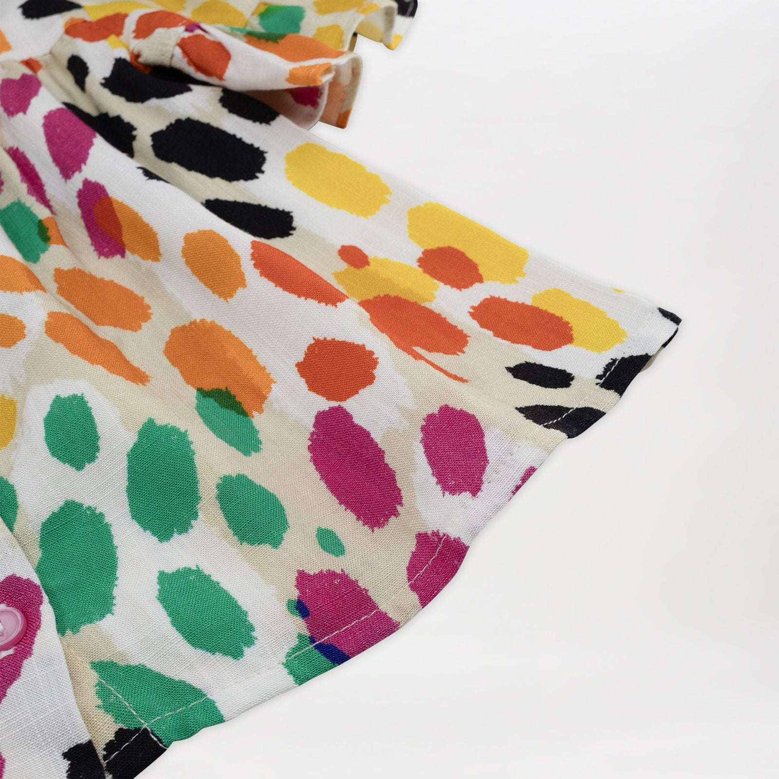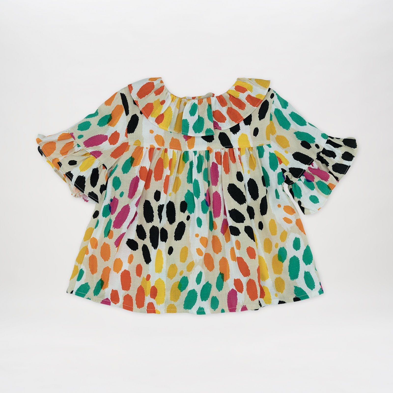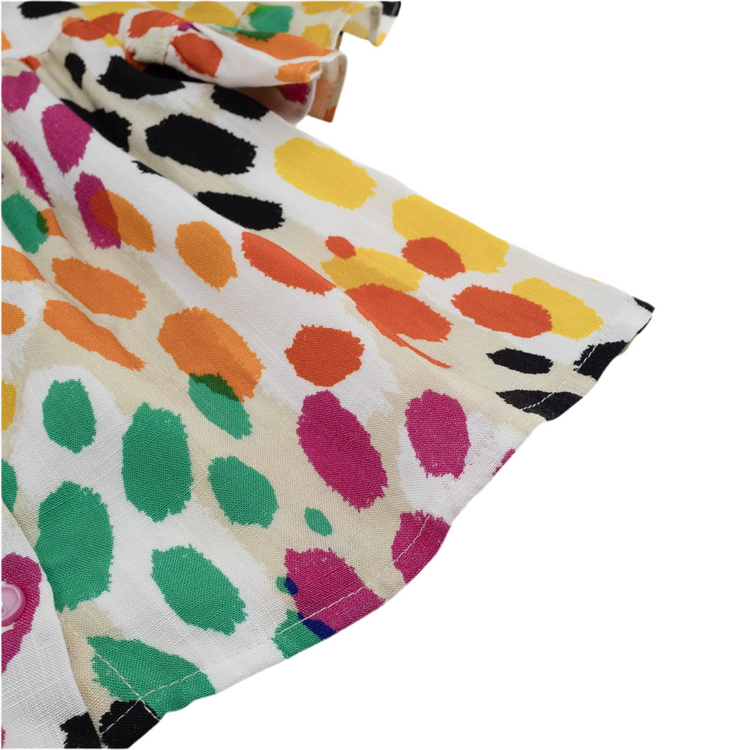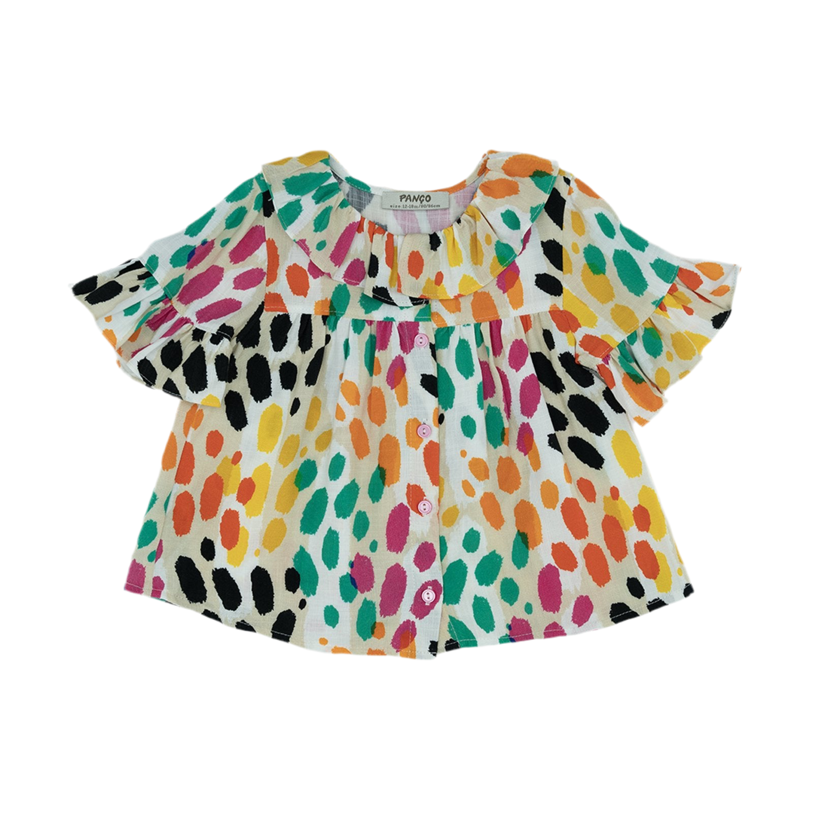 Imbraca-ti micuta cu aceasta Bluza vaporoasa cu maneca scurta si volane PANCO - Hope, perfecta pentru zilele calduroase de vara si primavara. Confectionata din material 100% viscoza, aceasta bluza ofera un confort ideal pentru pielea delicata a copiilor intre 0 si 3 ani. Bulinele colorate adauga un plus de veselie tinutei oricarei fetite.