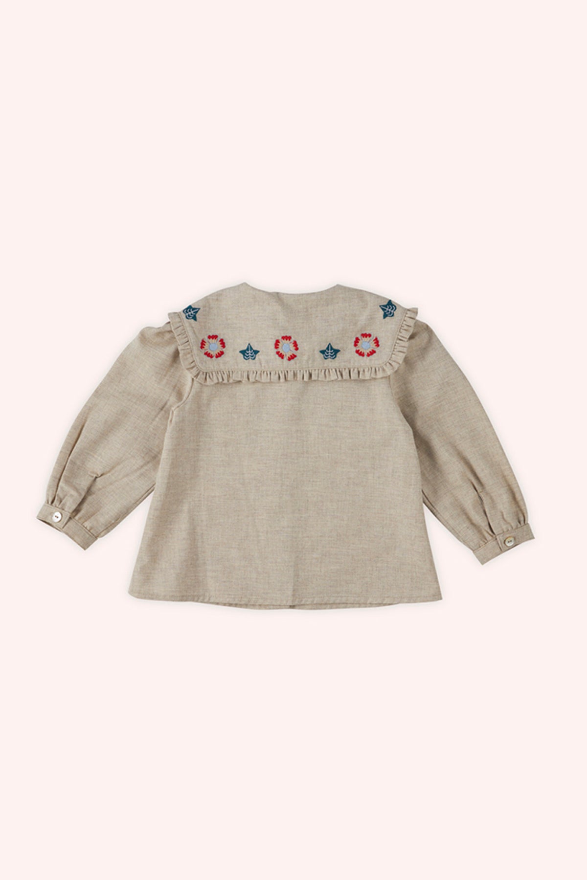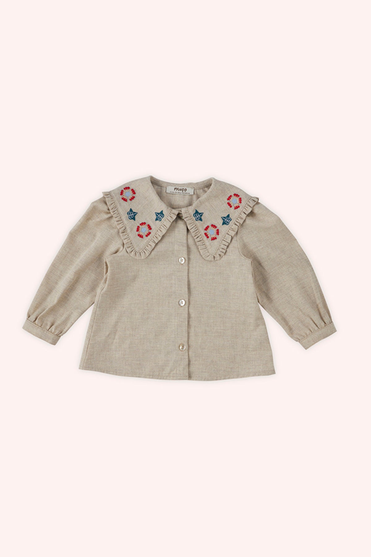 Cu un guler larg și mâneci lungi, această cămașă este perfectă pentru iarnă, fiind atât stilată, cât și practică. Partea din față este brodată cu detalii delicate, ce conferă un aspect rafinat, iar țesătura adaugă un aer fin și durabil.