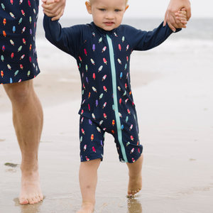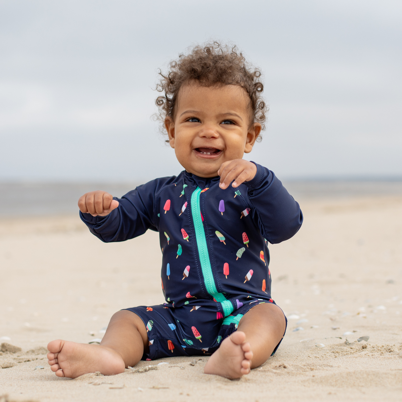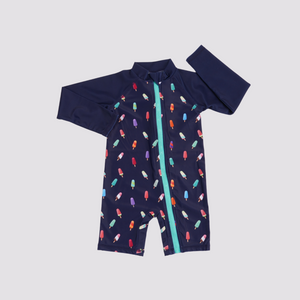 Costum de baie cu protectie solara UPF 50+, ZIPSTER - Swimster Ice Pop, Albastru Navy cu model inghetata, pentru fetite sau baietei