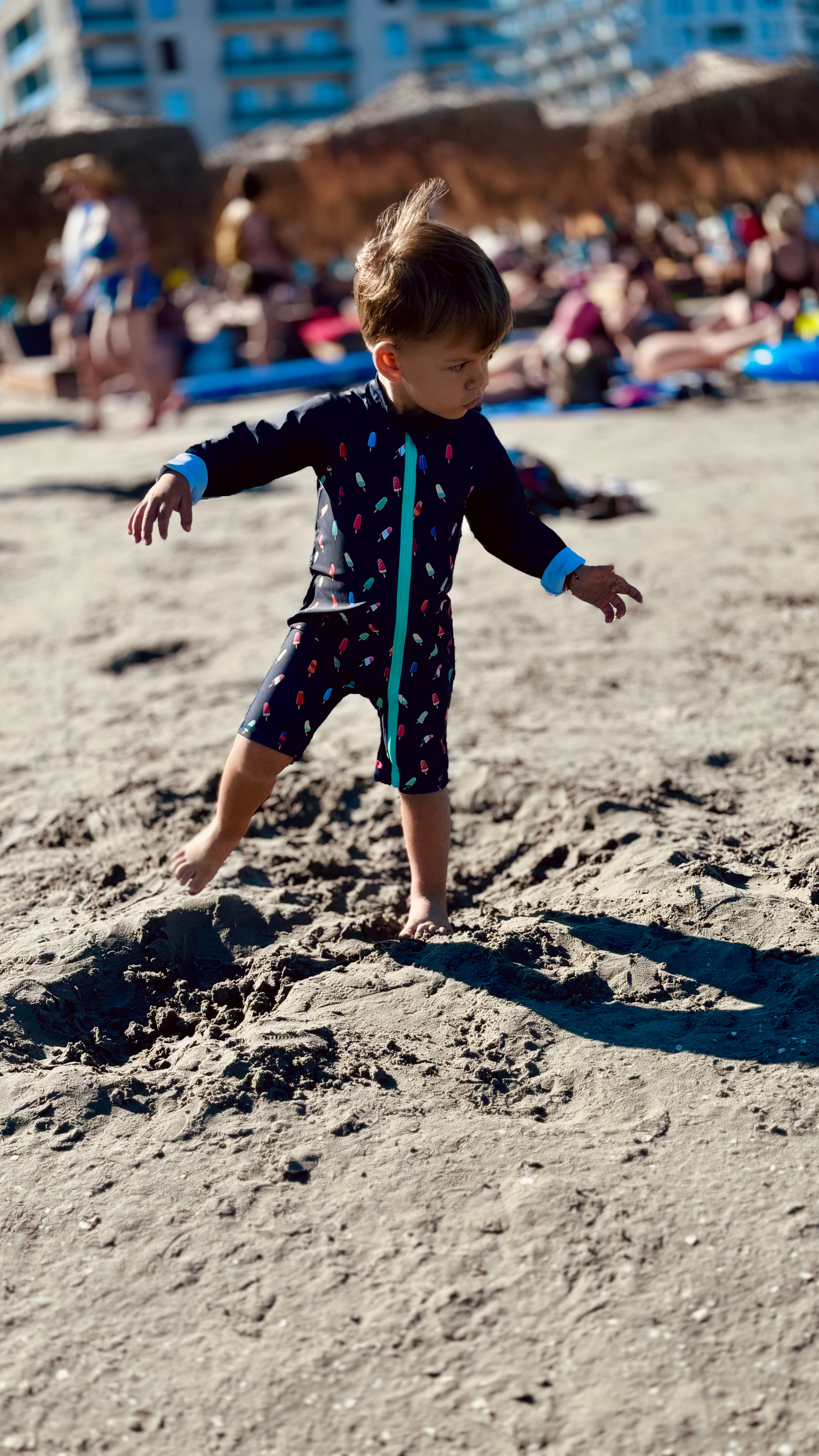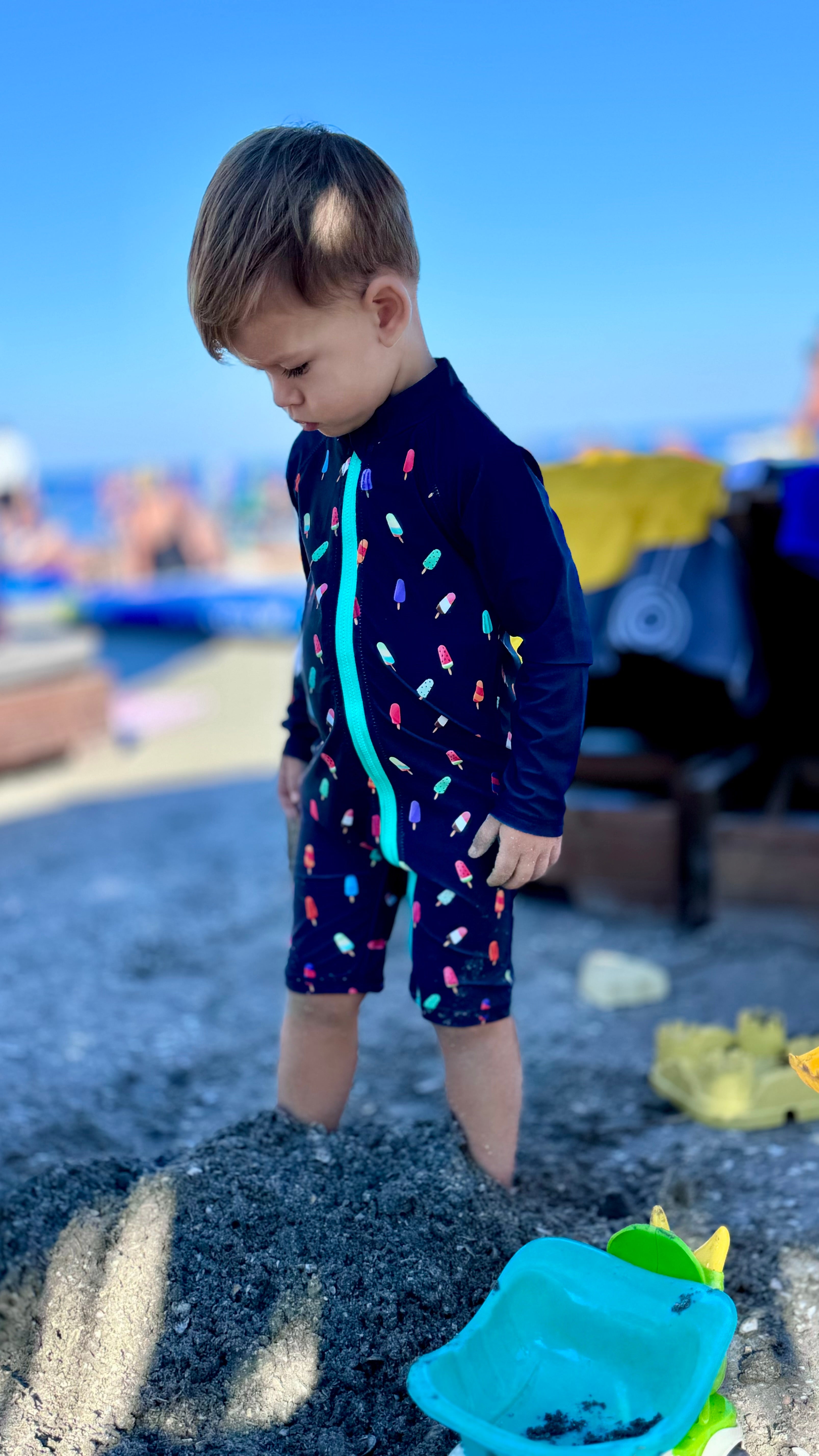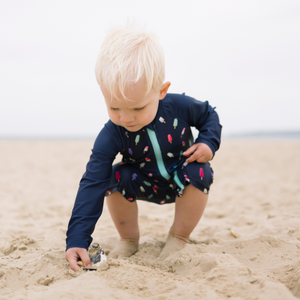 Costumul de baie perfect pentru vara cu protectie UPF 50+, are un model vesel, putand fi purtat atat de baietei cat si de fetite. Materialul este rezistent pentru multiplele utilizari din cursul unei veri, uscarea acestuia este rapida, iar inchiderea se face printr-un fermoar vertical situat in fata, ce faciliteaza imbracarea / dezbracarea rapida a bebelusului (mai ales in cazurile de schimbare a pampersului).