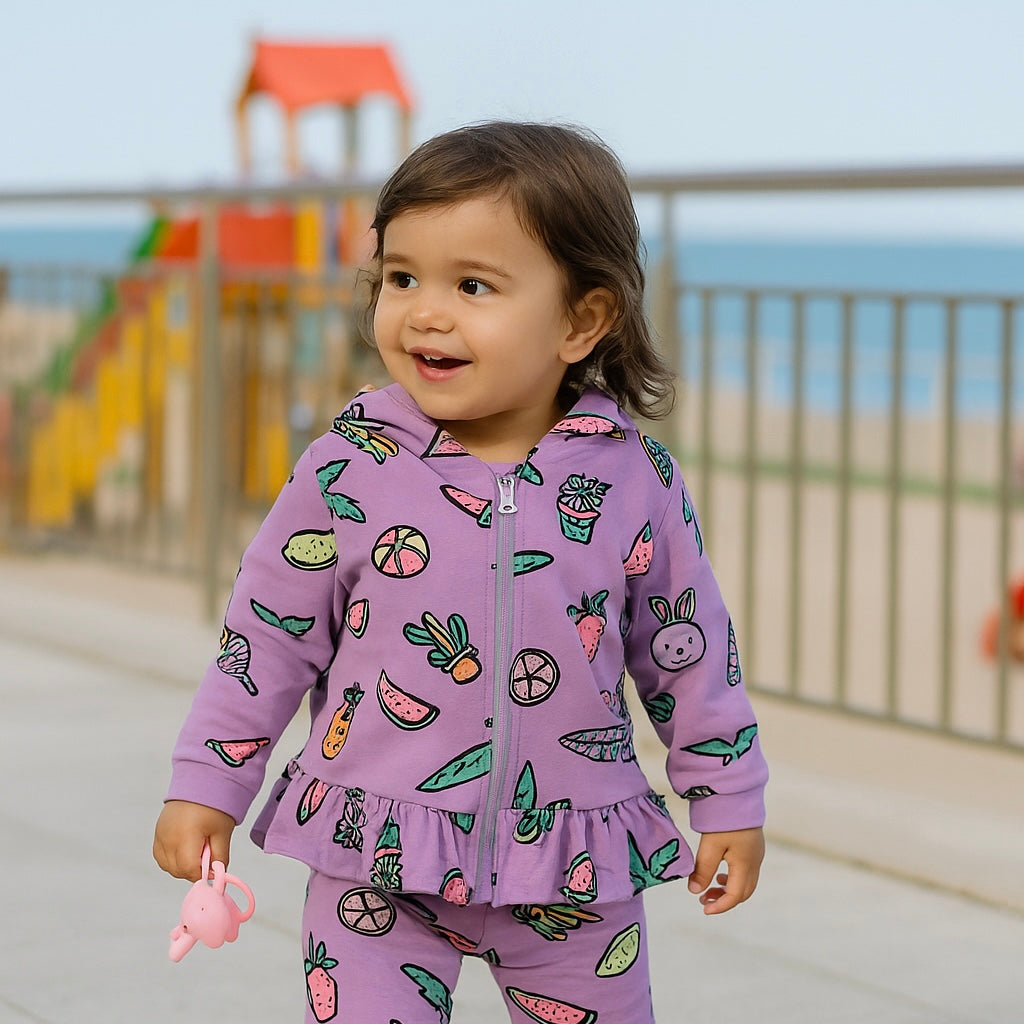 Acest hanorac mov cu gluga si fermoar pentru fetite de la PANCO, denumit "Surf Up", este perfect pentru cei mici cu varsta cuprinsa intre 0-3 ani. Creat dintr-un blend de 47% bumbac, 47% poliester si 6% elastan, acest hanorac ofera confort si durabilitate. Gluga adauga un plus de protectie, iar imprimeul vesel aduce un strop de culoare in garderoba micutei tale.