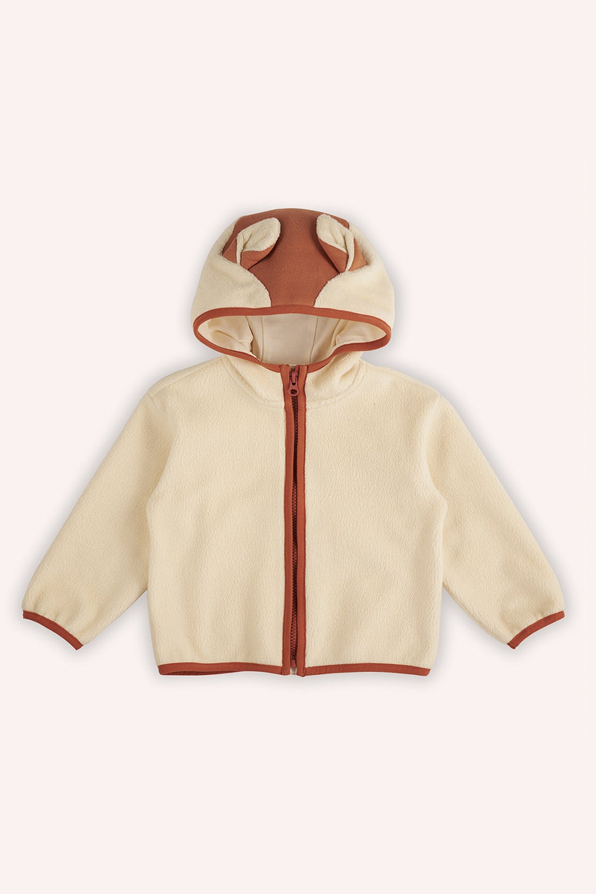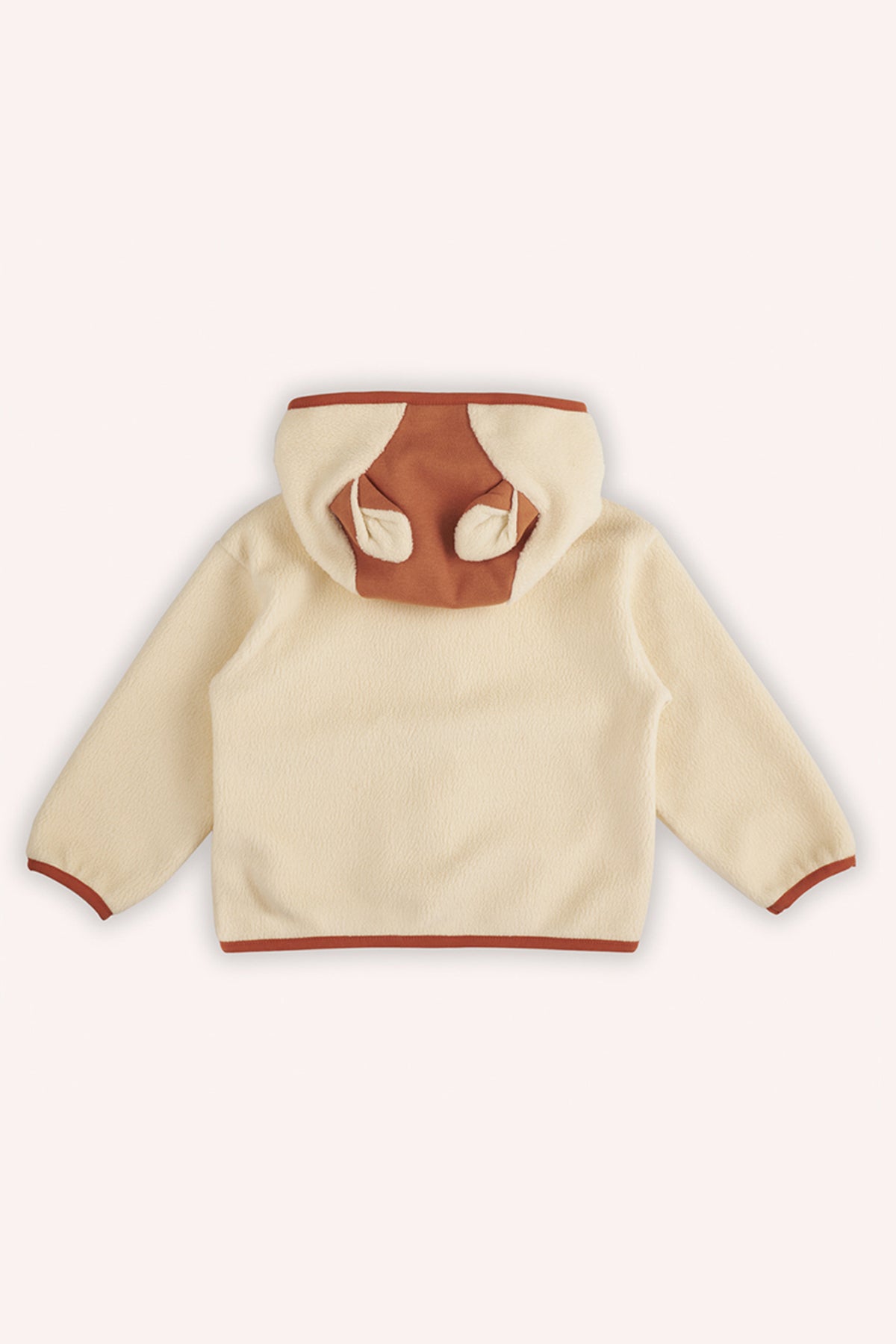 Cu glugă echipată cu urechiușe drăguțe de vulpe, acest hanorac în nuanțe de ecru și caramel adaugă un plus de farmec și joacă ținutei zilnice. Modelul lejer și mânecile lungi asigură libertate de mișcare, iar fermoarul facilitează îmbrăcarea.