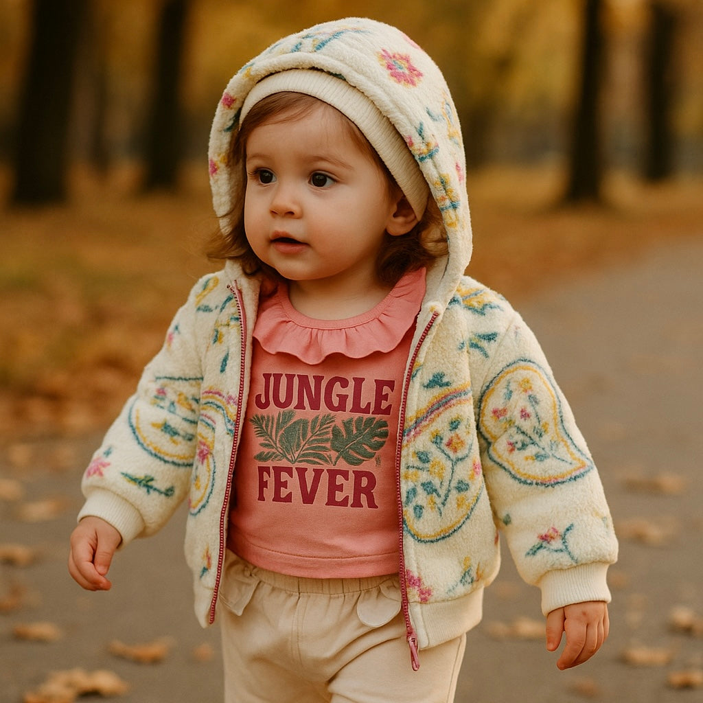 Această jachetă cu glugă și fermoar roz este alegerea perfectă pentru micuțele fashioniste! 🧸 Cu un imprimeu vesel și colorat, jacheta aduce un strop de culoare în zilele răcoroase. Construită din material teddy moale, aceasta oferă căldură și confort optim pentru fetițele cu vârste între 0 și 3 ani.
