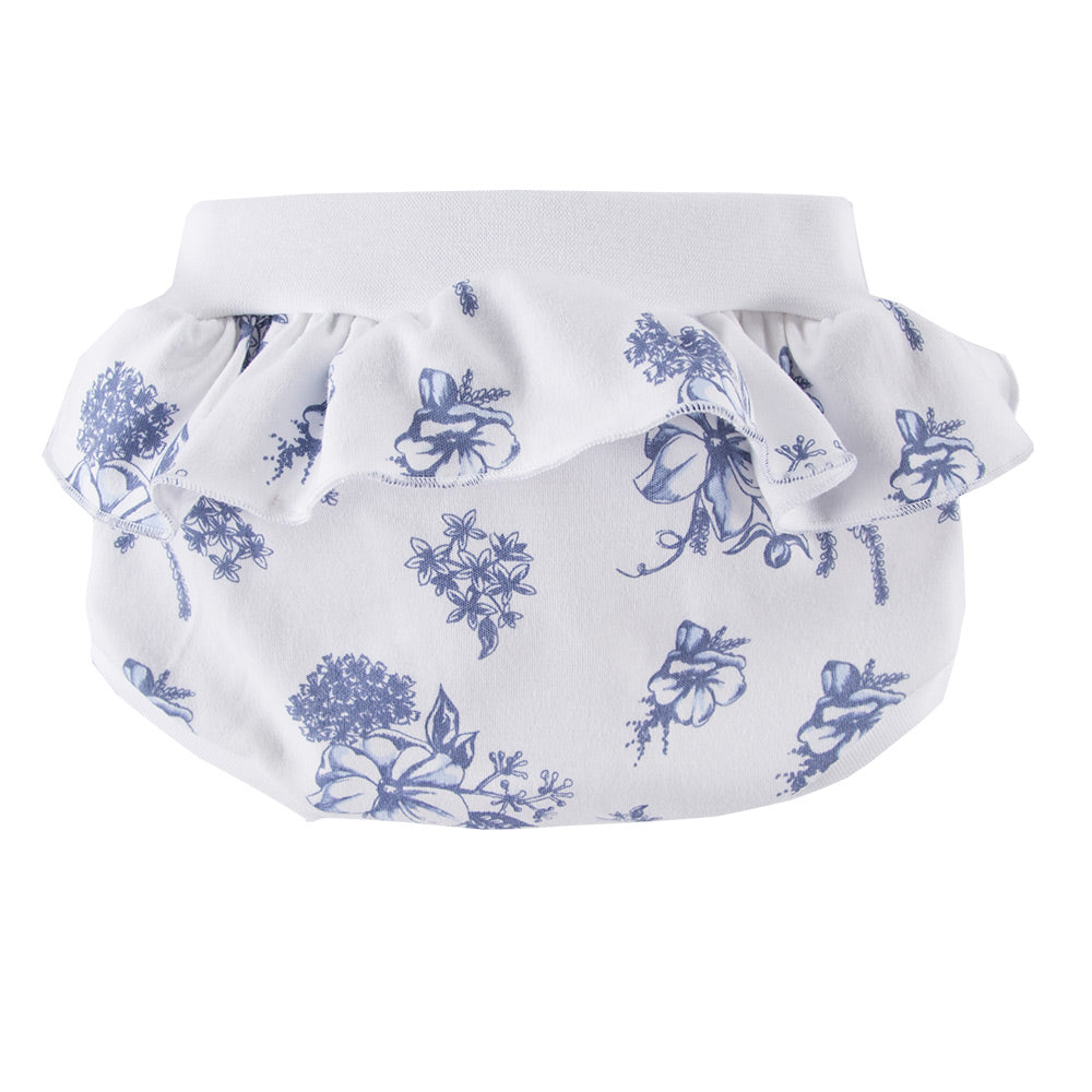 Pantaloni scurti bufanti cu volan in talie EEVI Bloomers - Botanic, Alb cu flori albastre, pentru fetite