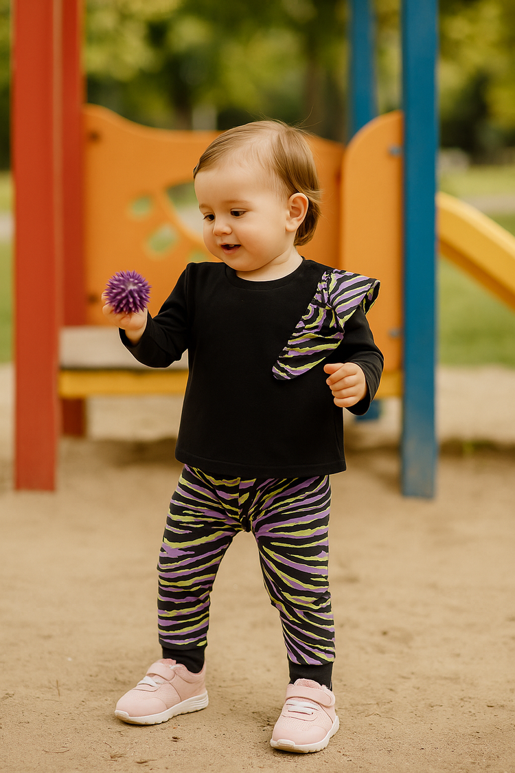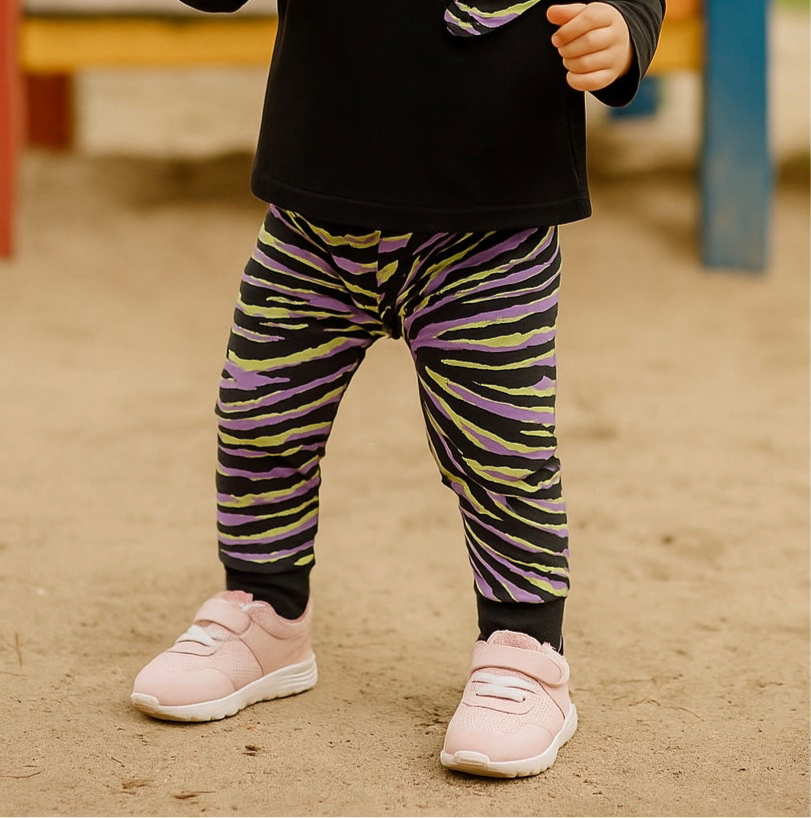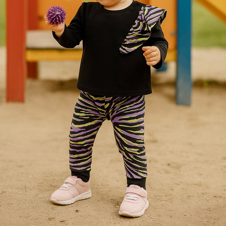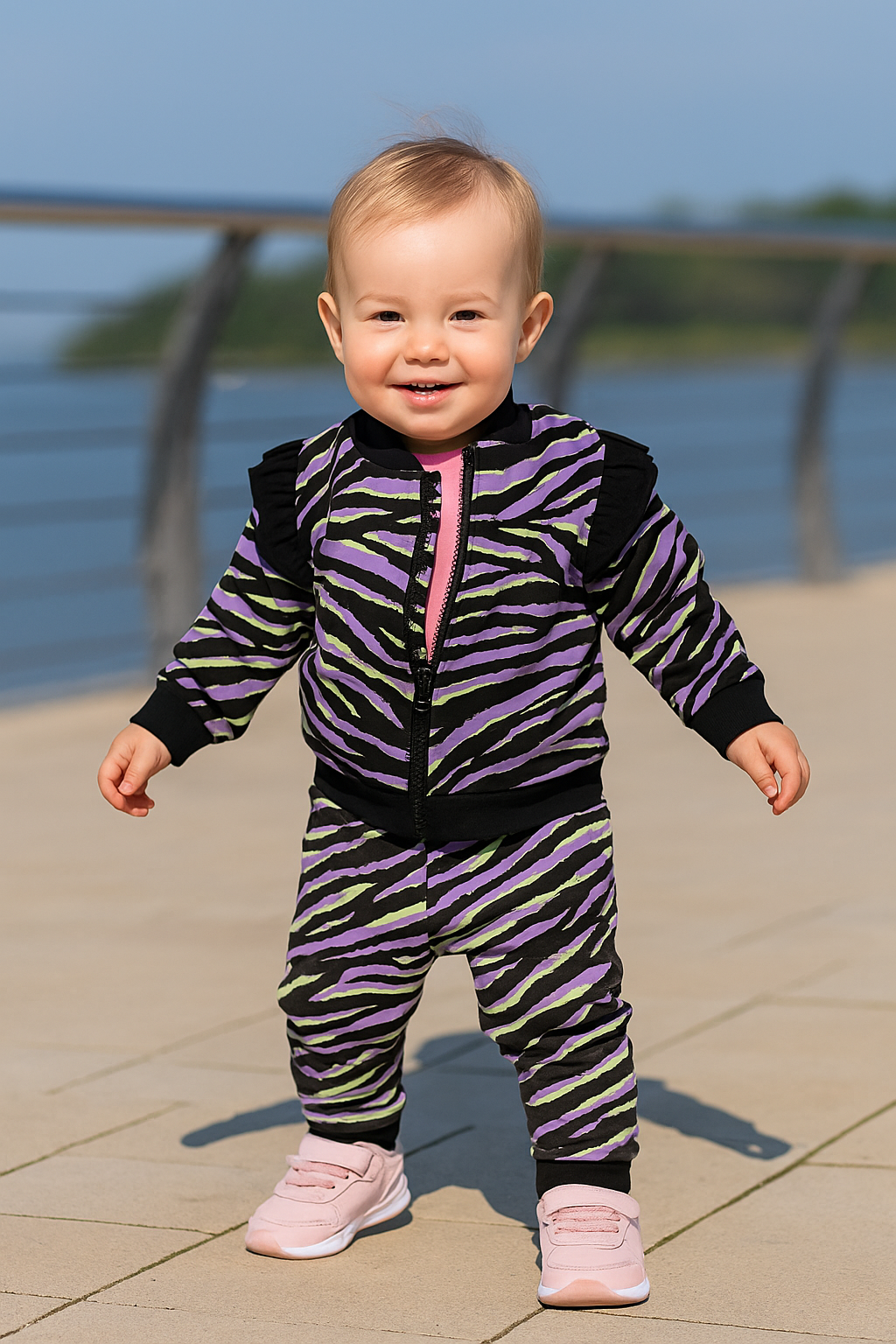 Pantalonii sport PANCO Zebra, in nuante de negru si mov, sunt alegerea ideala pentru fetitele cu varste cuprinse intre 0 si 3 ani. Realizati dintr-un amestec de bumbac si elastan, acesti pantaloni ofera confort si flexibilitate, fiind perfect adaptati pentru aventurile zilnice ale micutei tale. Cu un design inspirat de tema ZEBRA'S, acestia aduc un plus de stil garderobei oricarei fetite.