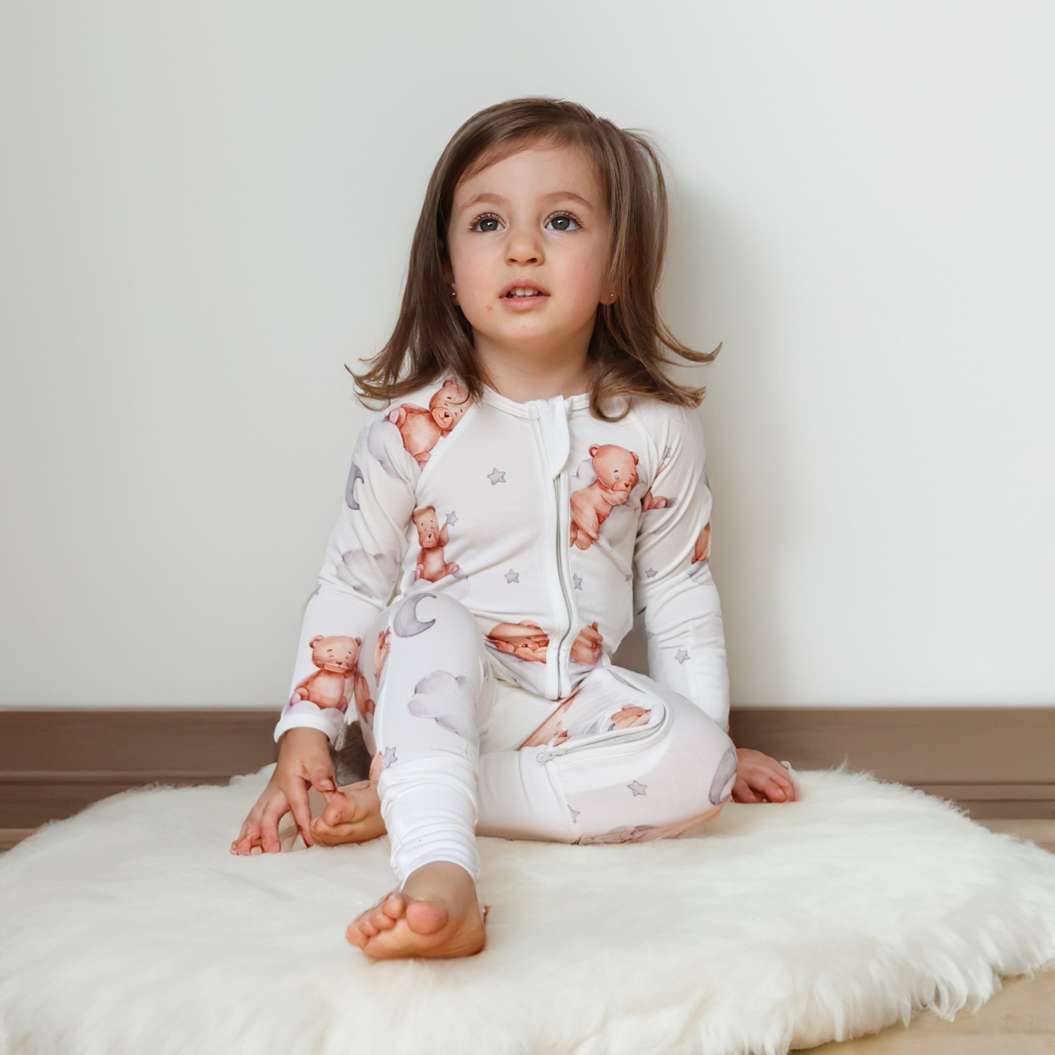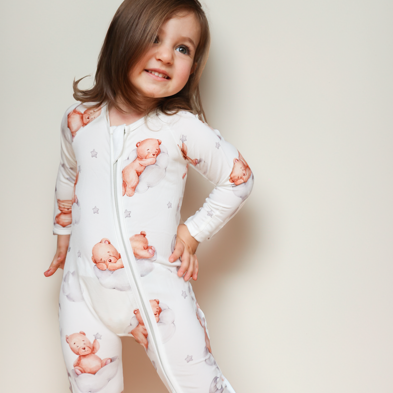 Pijamale lungi din bambus cu fermoar reversibil, ZIPSTER - Cuddles, Alb, pentru fetite