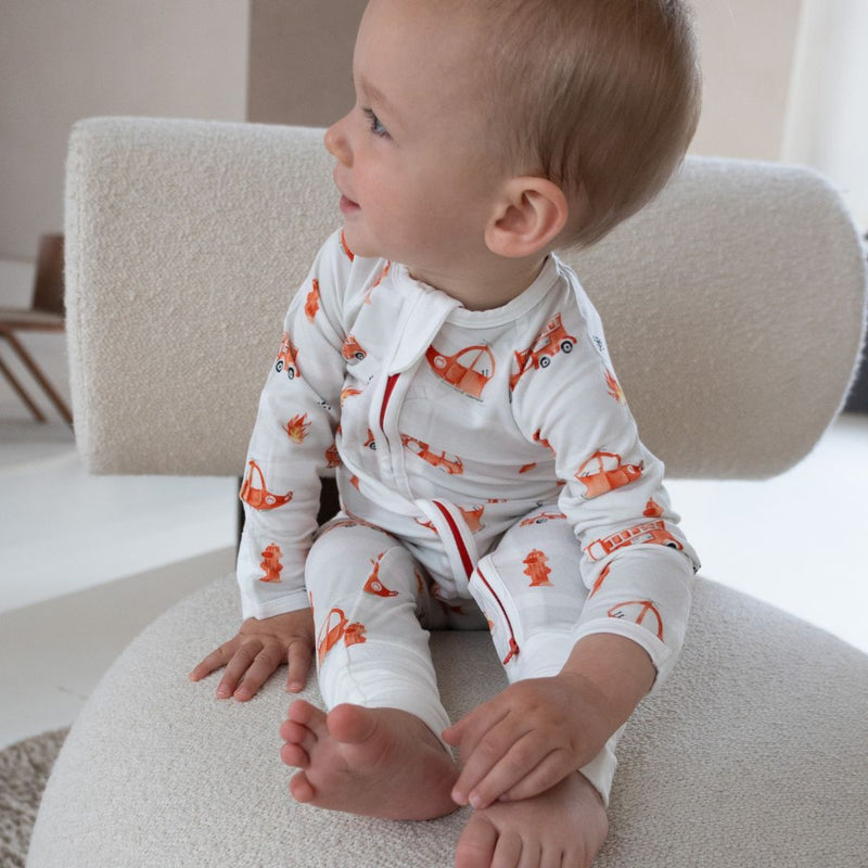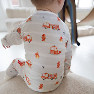 Pijamale lungi din bambus cu fermoar reversibil, FireTruck, pentru bebe baieti