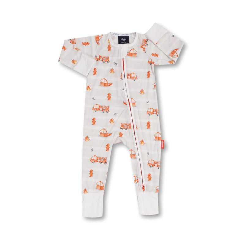 Pijamale lungi din bambus cu fermoar reversibil, ZIPSTER - FireTruck, Alb cu Portocaliu, pentru baieti