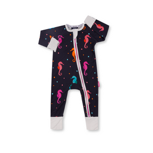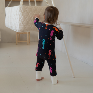 Pijamale lungi din bambus cu fermoar reversibil, ZIPSTER - SeaHorse, Bleumarin cu caluti de mare Multicolori, pentru fetite