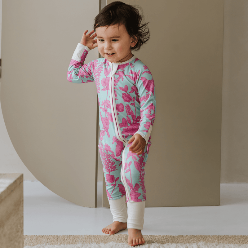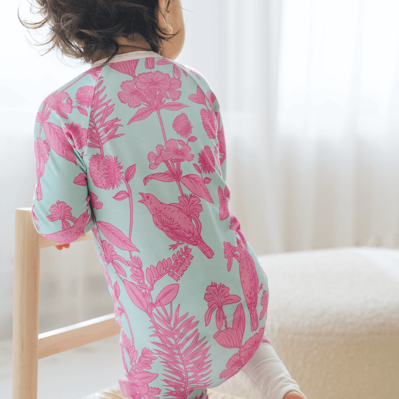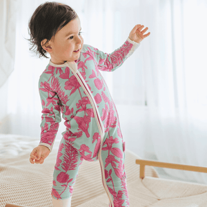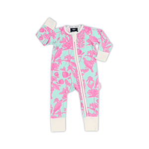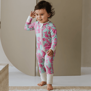 Pijamale lungi din bambus cu fermoar reversibil, ZIPSTER - SongBird, Turcoaz cu floricele Roz, pentru fetite