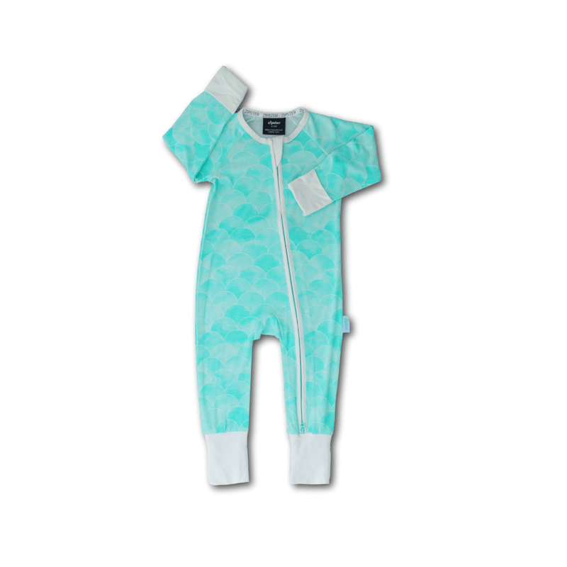 Pijamale lungi din bambus cu fermoar reversibil, ZIPSTER - Waves, Alb cu Turcoaz, pentru fetite si baietei