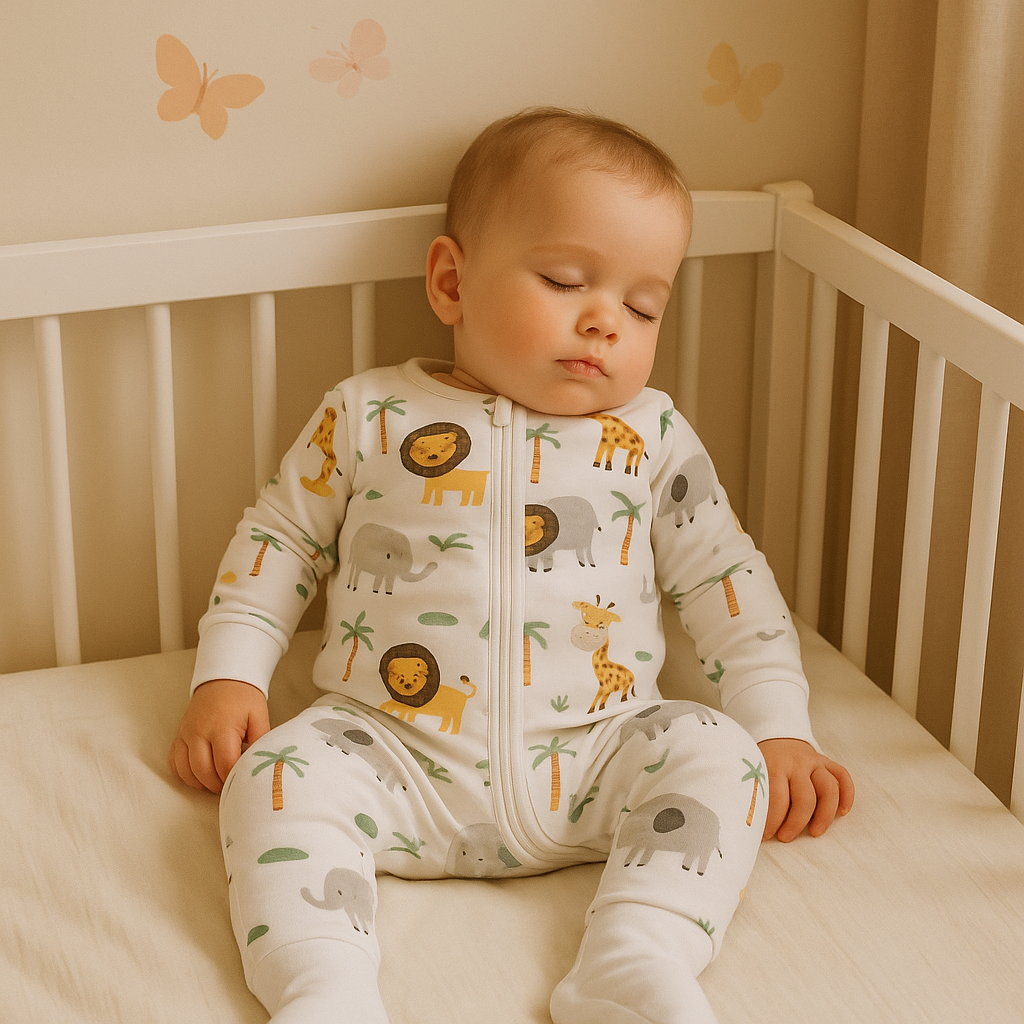 Pana la varsta de 12 luni, pijamaua este prevazuta cu mansete tip manusa special pentru a fi evitate zgarieturile pe timpul noptii, iar la picioare manseta este tip soseta, pentru a mentine caldura talpilor pe timpul somului, iar ziua pot fi utilizate ca mansete normale.