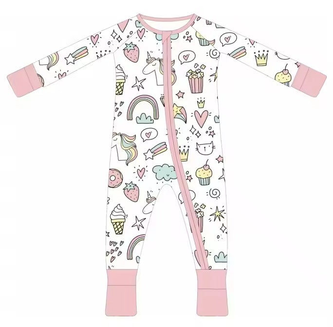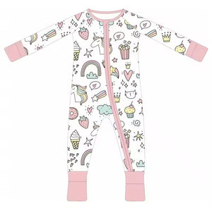 Pijamale lungi din bambus cu fermoar reversibil, Pink Unicorn , Roz, pentru fetite