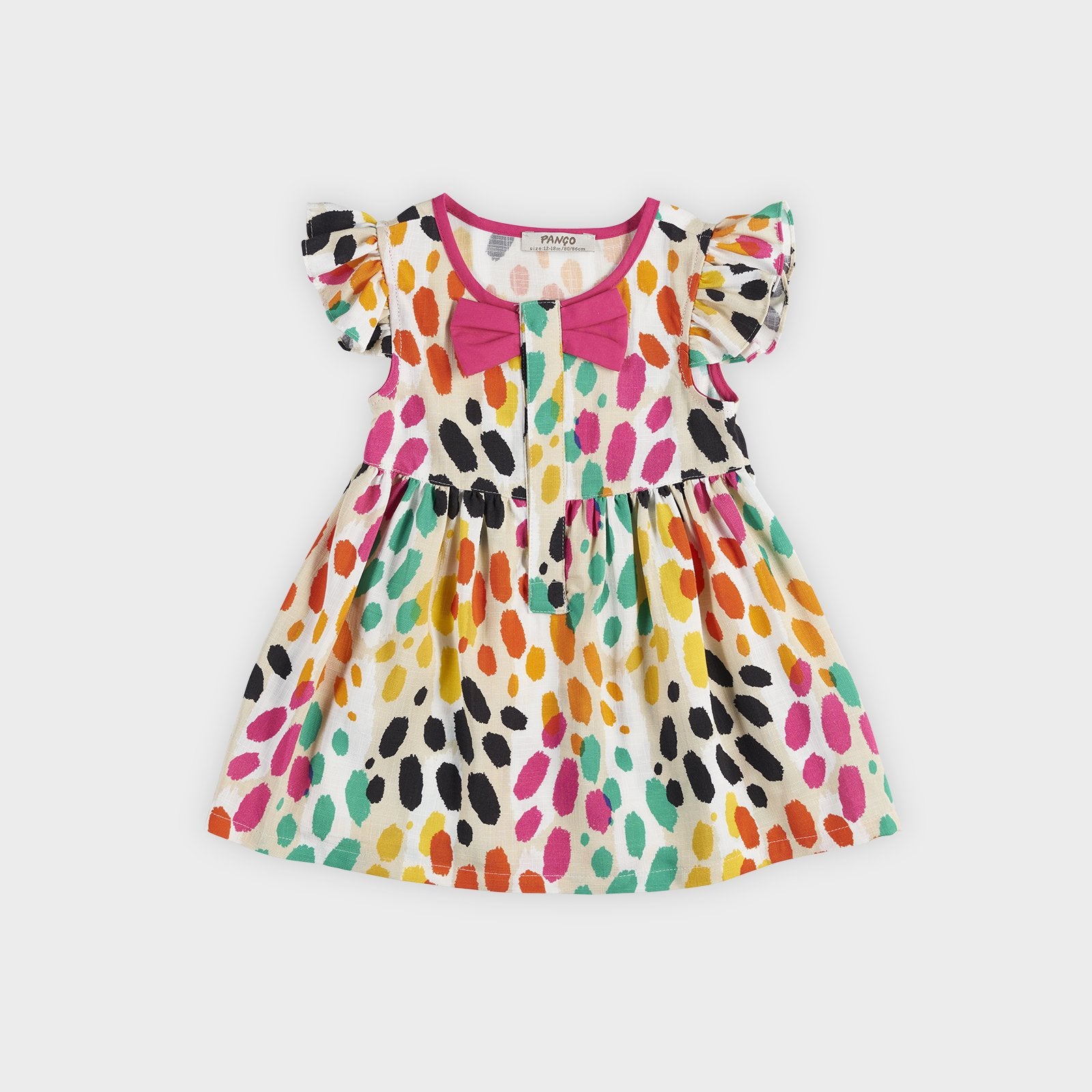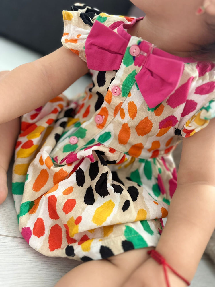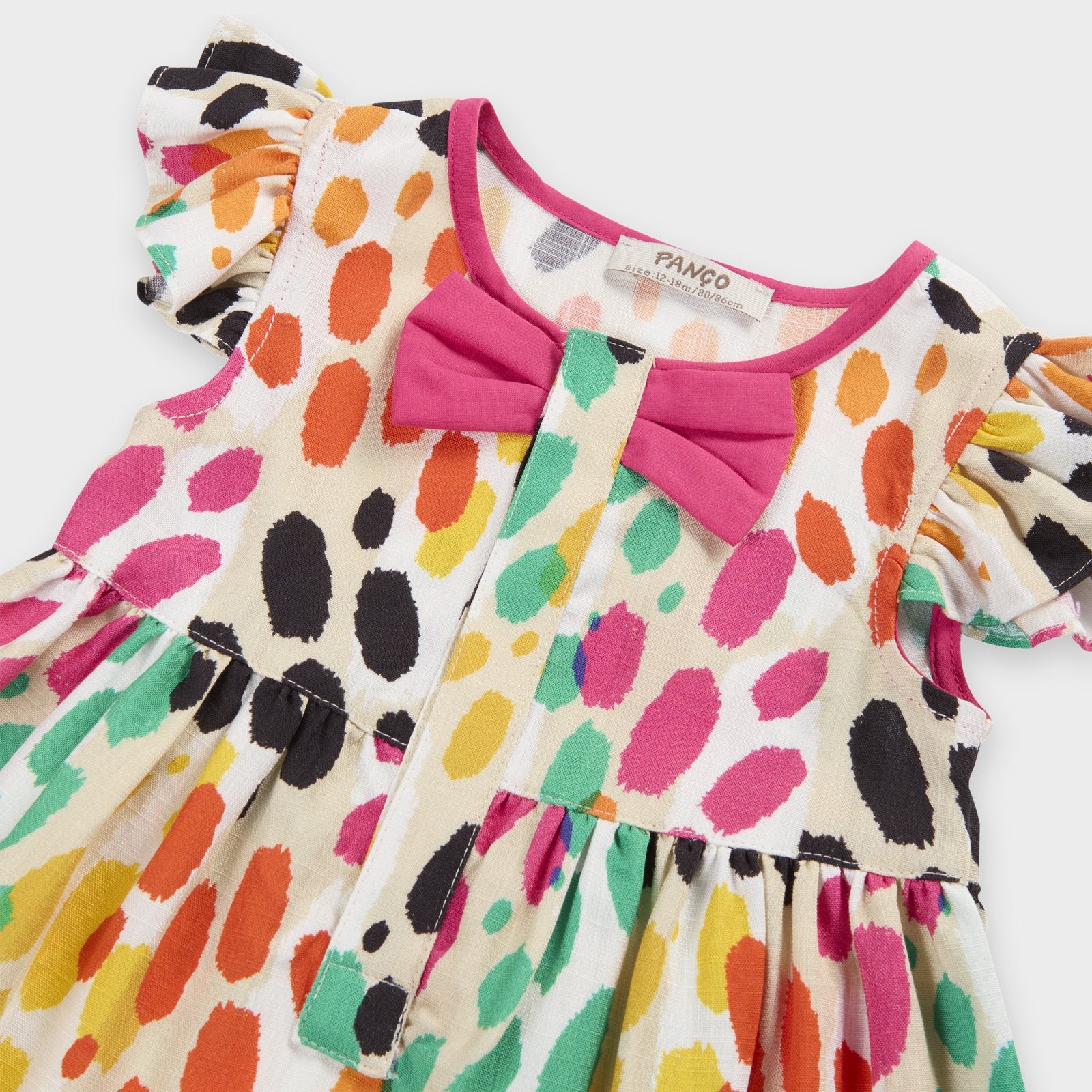 Rochiță elegantă și comodă, cu un imprimeu vesel, mâneci cu volane și fundiță roz la guler. Poate fi purtată atât la un eveniment festiv, cum ar fi o aniversare sau un botez, cât și la o plimbare în oraș.