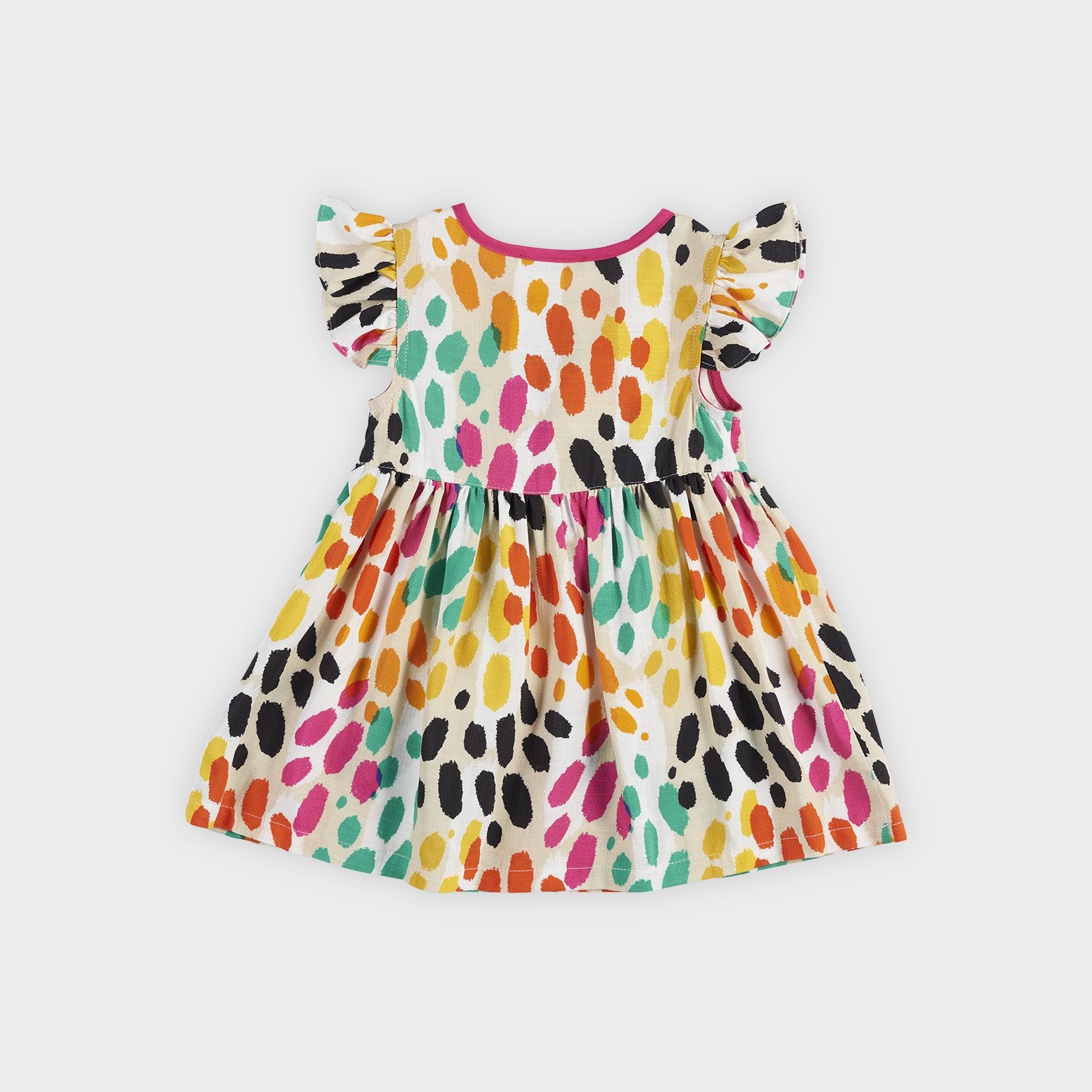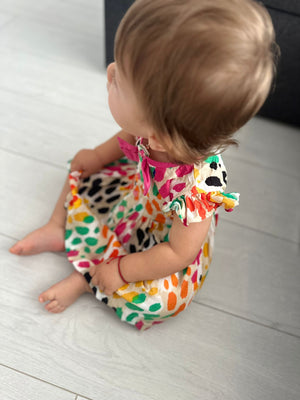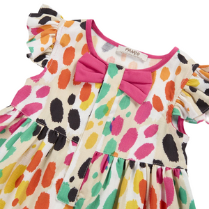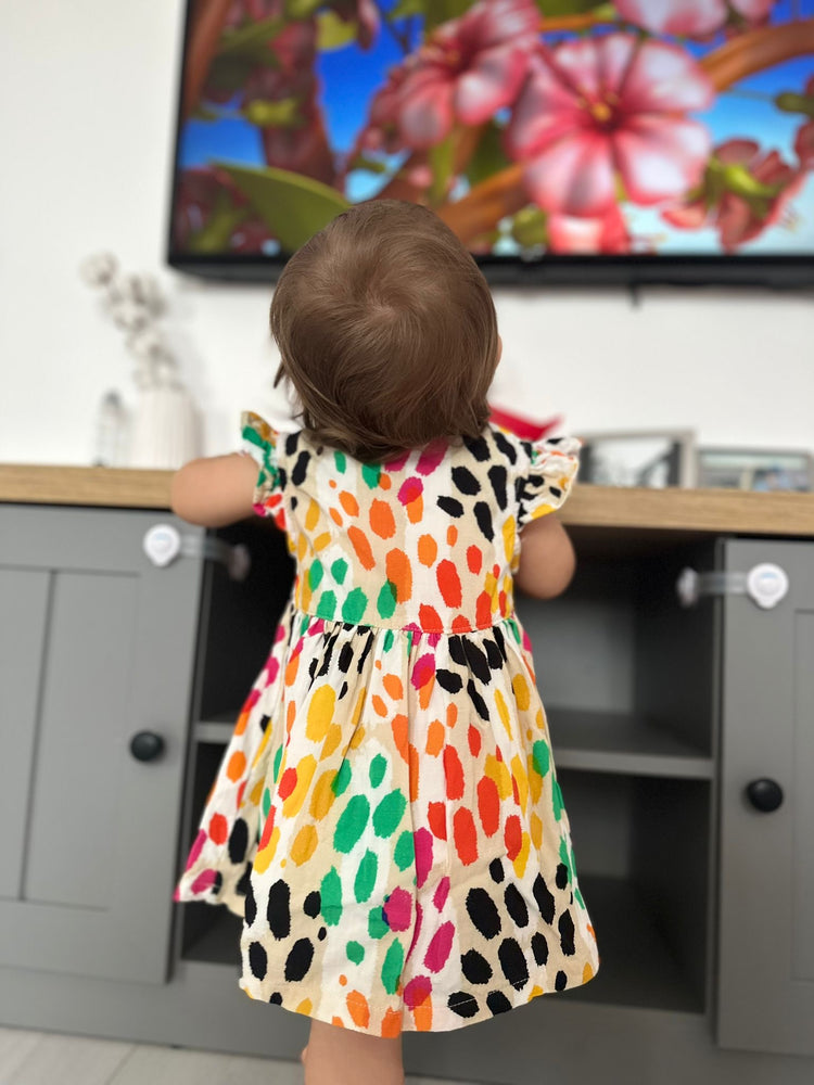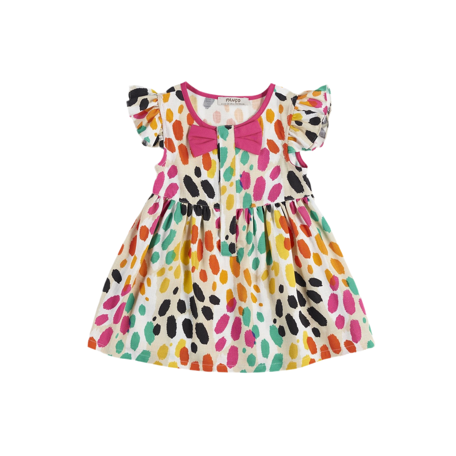 Rochiță elegantă și comodă, cu un imprimeu vesel, mâneci cu volane și fundiță roz la guler. Poate fi purtată atât la un eveniment festiv, cum ar fi o aniversare sau un botez, cât și la o plimbare în oraș.