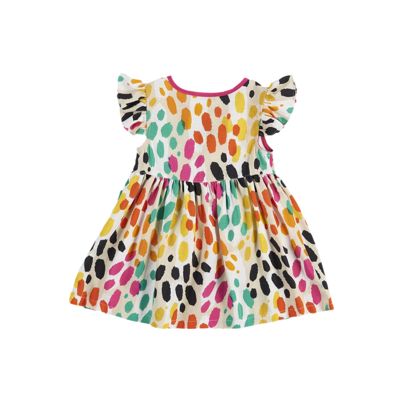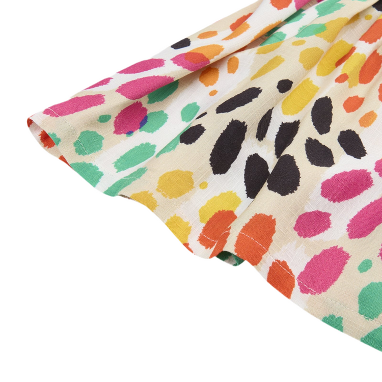 - Design: Rochie imprimata tip leopard, bej cu buline colorate, perfecta pentru a adauga un strop de veselie garderobei.