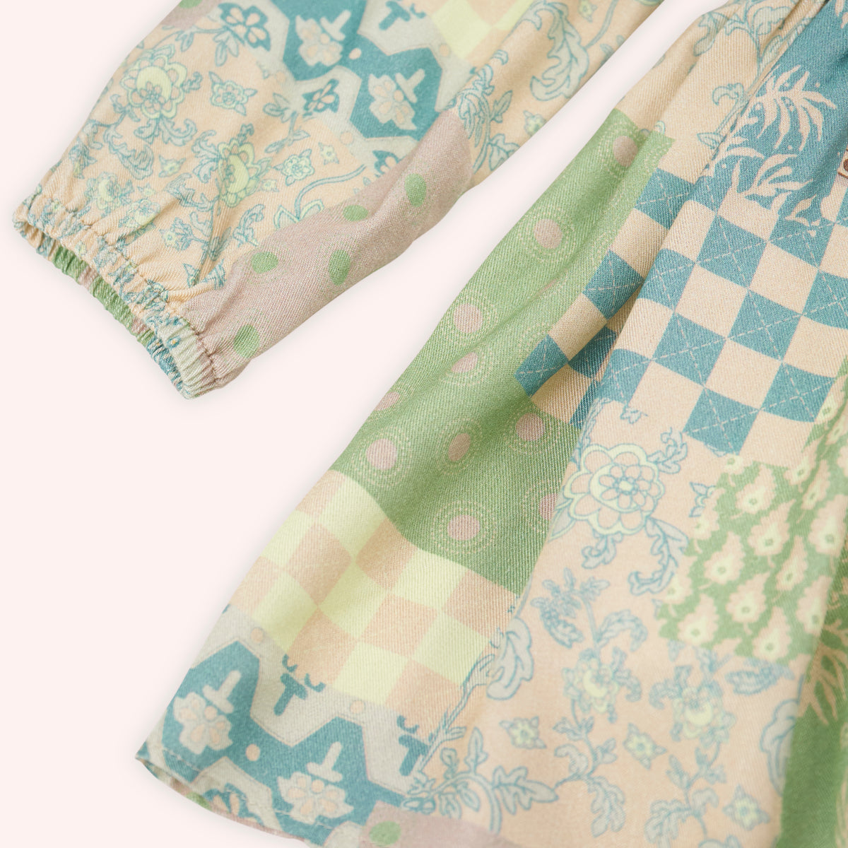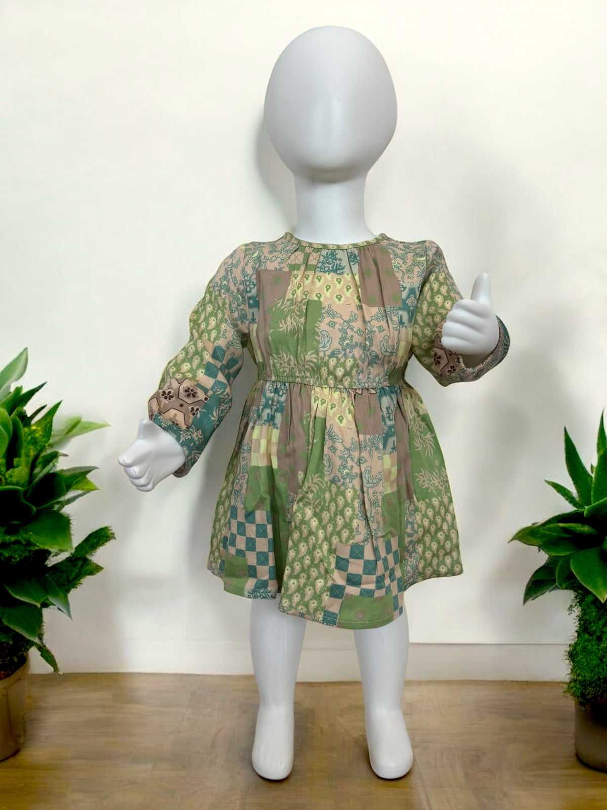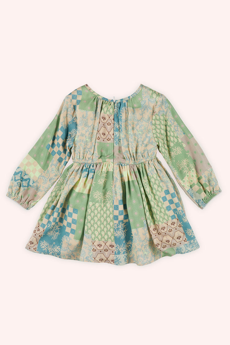 Rochie cu maneca lunga si elastic in talie, PANCO - Botanic Garden, Bej & Verde, pentru fetite