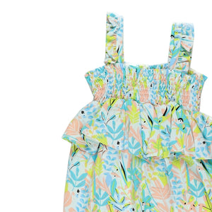 Salopeta cu volan si imprimeu colorat PANCO - Jungle, Verde Mint, pentru fetite
