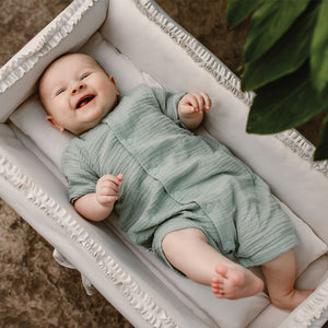 Pentru micutii exploratori, Salopeta scurta din muselina, EEVI - Pearlfect ofera un mix perfect intre stil si functionalitate. Conceputa pentru a asigura libertatea de miscare necesara in timpul jocurilor si activitatilor zilnice, aceasta salopeta din muselina 100% este o alegere inspirata.