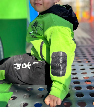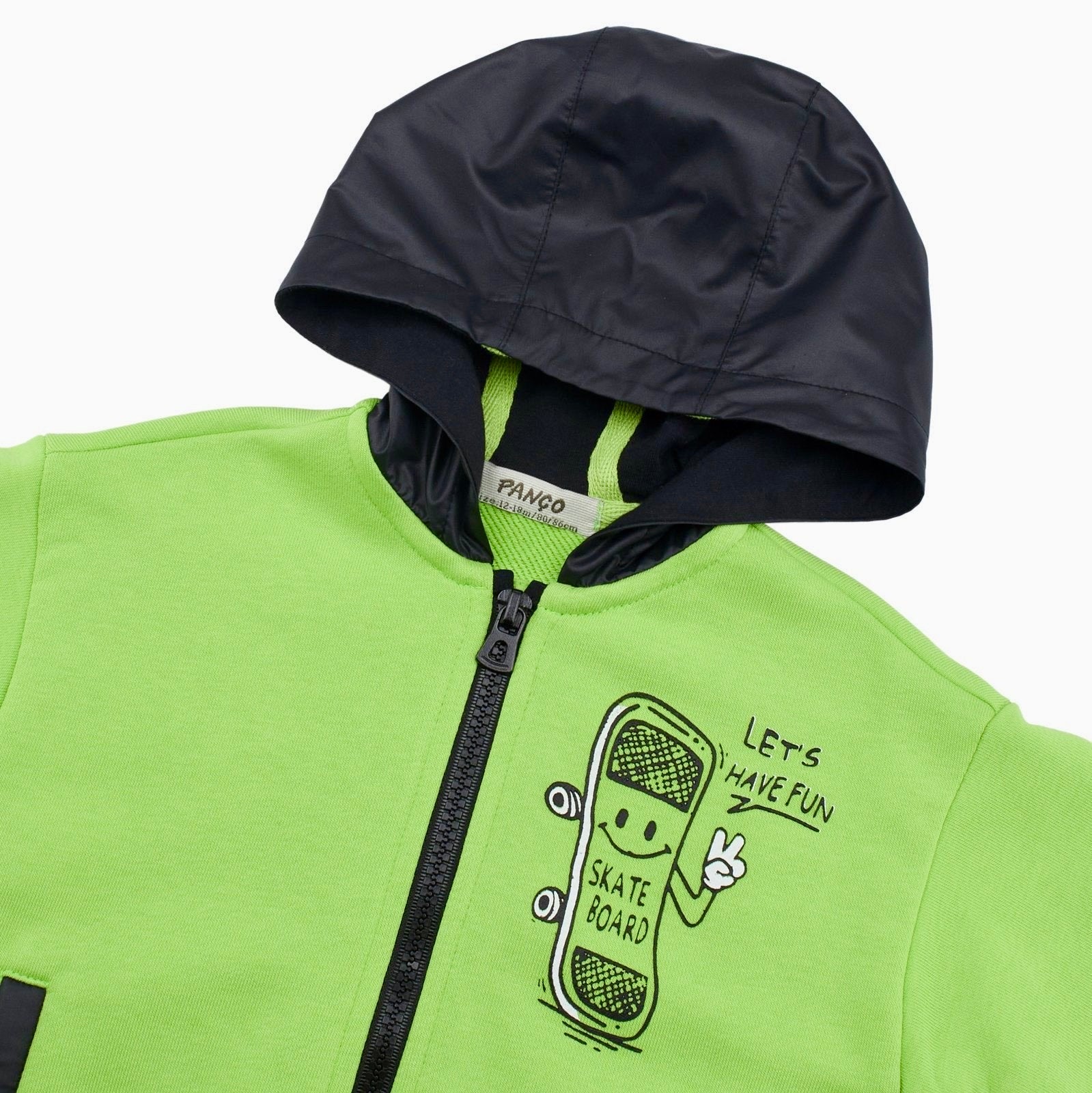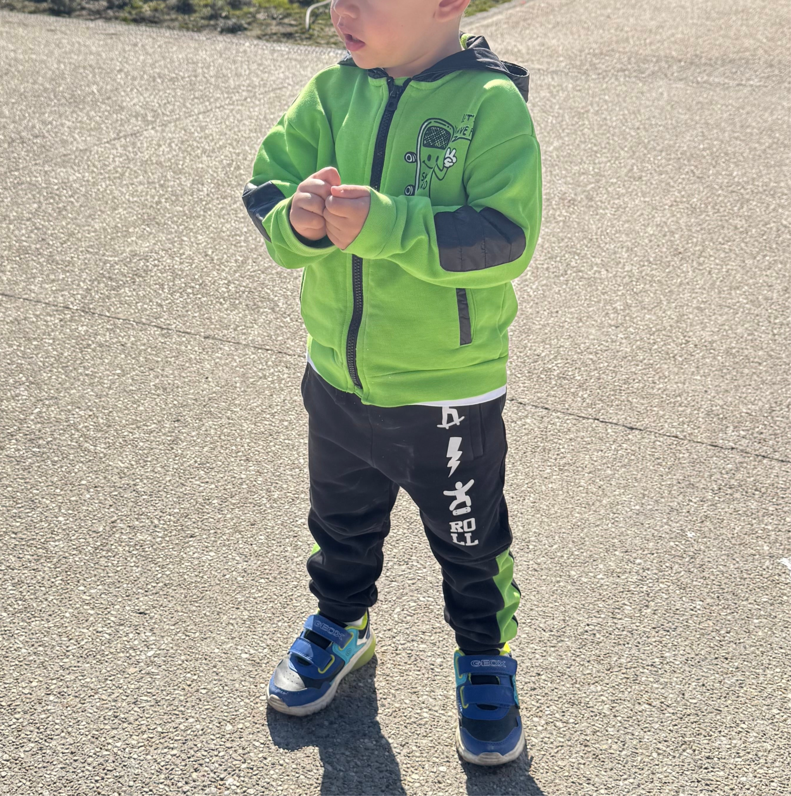 Setul sport PANCO - Natural Power, perfect pentru baietei activi. Contine hanorac si pantaloni in culorile verde si negru. Ideal pentru sezonul toamna/iarna. Realizat din 85% bumbac si 15% poliester, ofera confort si flexibilitate la fiecare miscare.