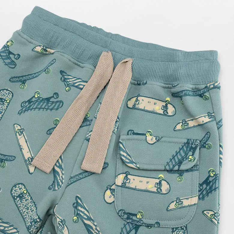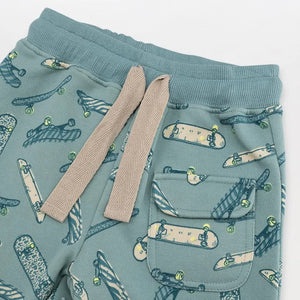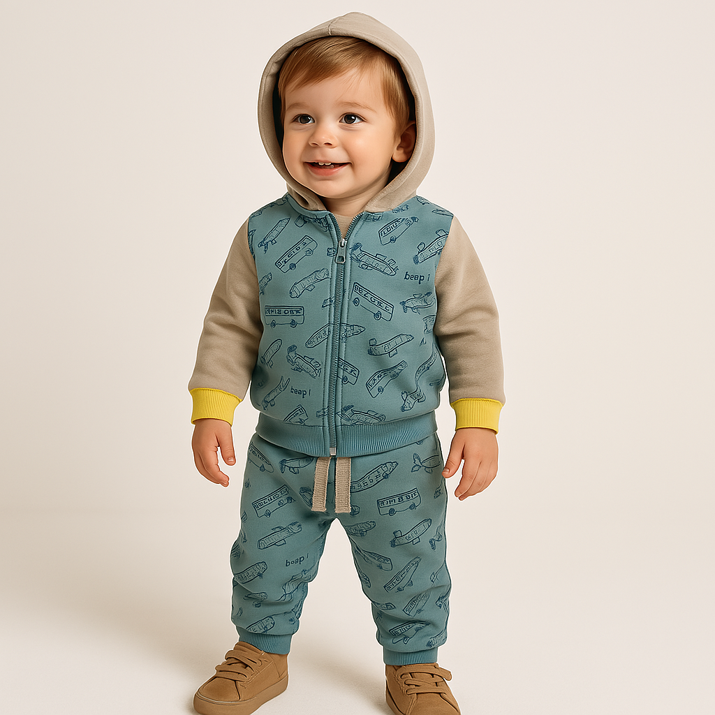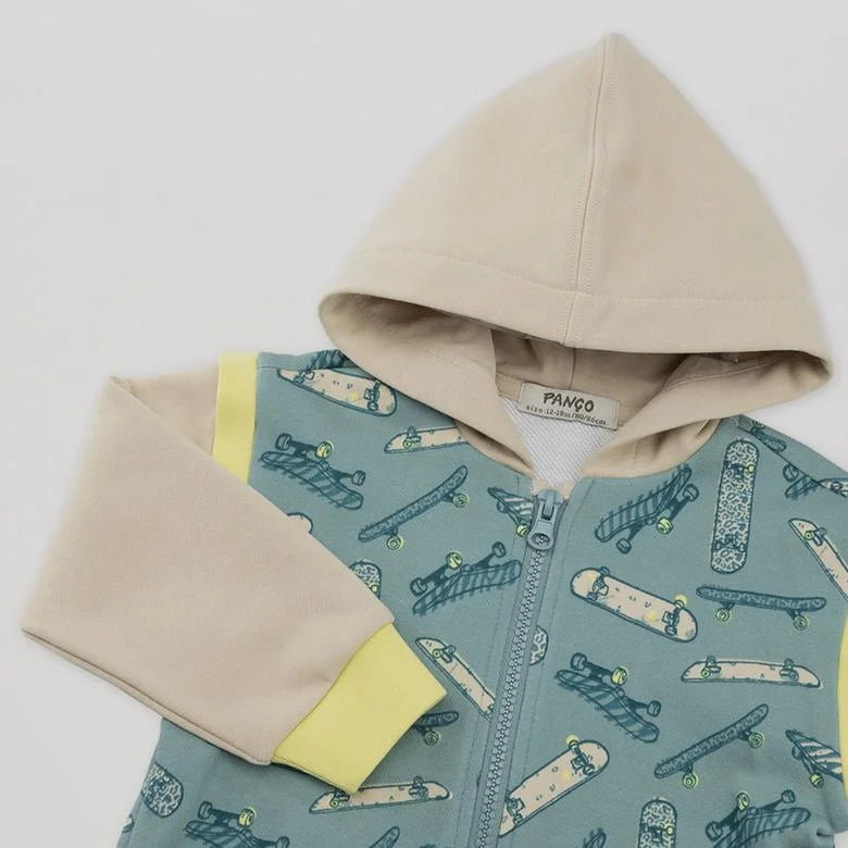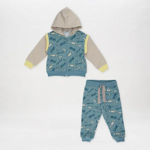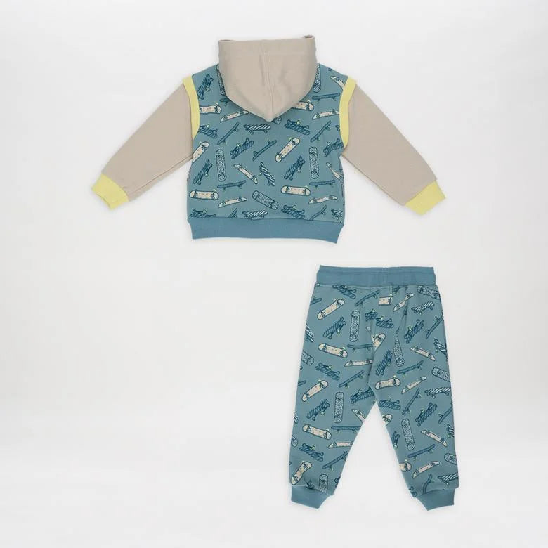 Set 2 piese sport: Bluza cu maneca lunga si gluga, pantaloni imprimati PANCO - Super Skater, Verde Mint si Bej, pentru baietei