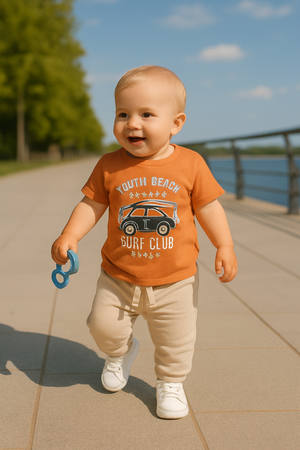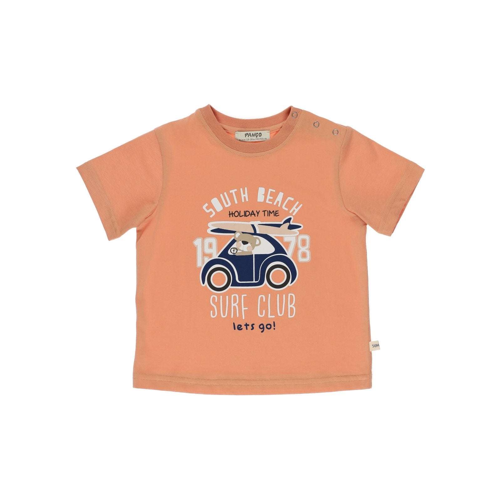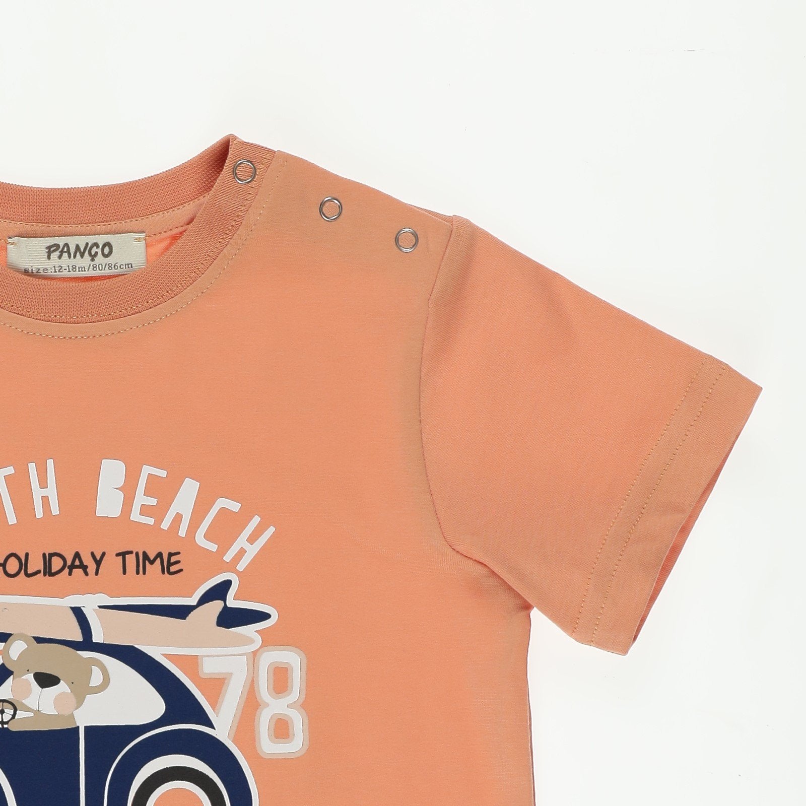 Tricoul PANCO - Holiday Time in culoarea Somon, pentru baietei este ideal pentru orice ocazie, combinand confortul cu stilul modern. Realizat 100% din bumbac, acest tricou cu maneca scurta este perfect pentru sezoanele calde.